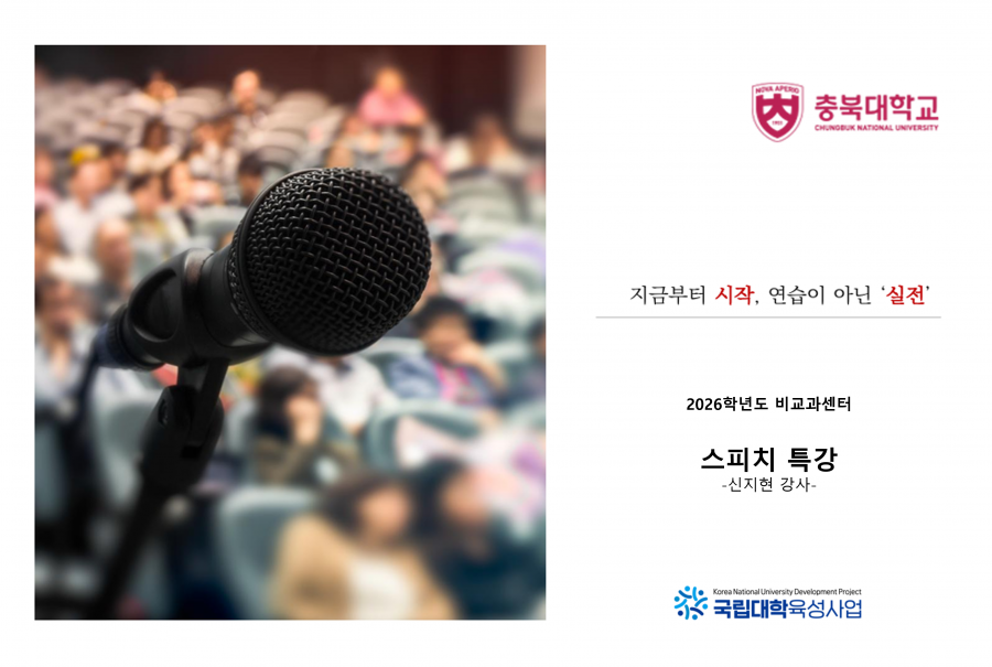 충북대학교 교양교육본부 비교과센터에서는 충북대학교 구성원들의 스피치 역량 향상을 위하여 스피치 특강을 개최하고자 합니다.